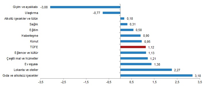 Aylık düşüş gösteren ana gruplar yüzde 3,08 ile giyim, ayakkabı ve yüzde 0,77 ile ulaştırma oldu.