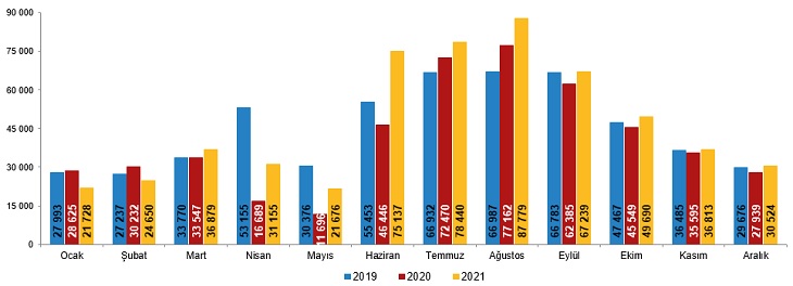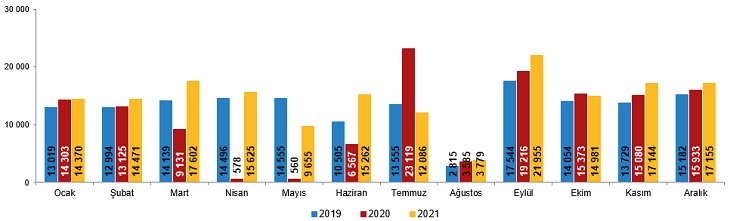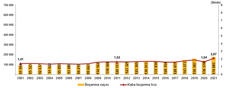 Boşanan çiftlerin sayısı 2020 yılında 136 bin 570 iken 2021 yılında 174 bin 85 oldu. Bin nüfus başına düşen boşanma sayısını ifade eden kaba boşanma hızı 2021 yılında binde 2,07 olarak gerçekleşti.