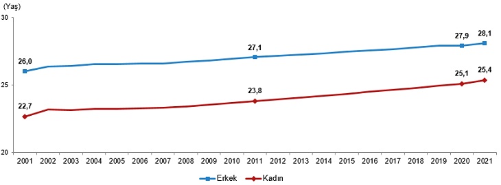 Yıllara göre ortalama ilk evlenme yaşı incelendiğinde, her iki cinsiyette de ilk evlenme yaşının arttığı görüldü. Ortalama ilk evlenme yaşı 2021 yılında erkeklerde 28,1 iken kadınlarda 25,4 oldu. Erkek ile kadın arasındaki ortalama ilk evlenme yaş farkı ise 2,7 yaş olarak gerçekleşti.