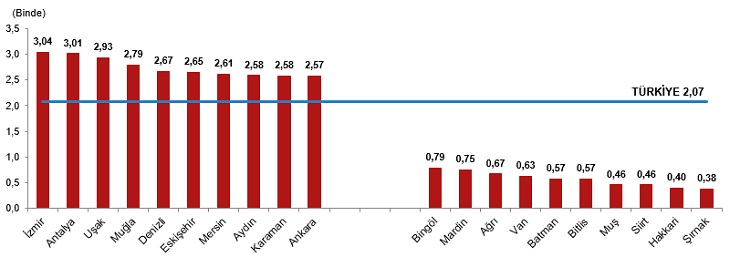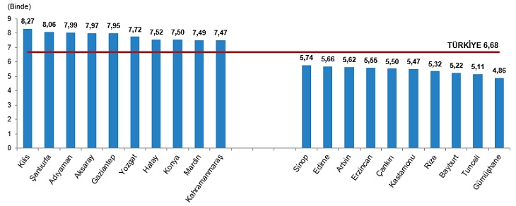 Kaba evlenme hızının 2021 yılında en yüksek olduğu il, binde 8,27 ile Kilis oldu. Bu ili binde 8,06 ile Şanlıurfa, binde 7,99 ile Adıyaman izledi. Kaba evlenme hızının en düşük olduğu il ise binde 4,86 ile Gümüşhane oldu. Bu ili binde 5,11 ile Tunceli, binde 5,22 ile Bayburt izledi.