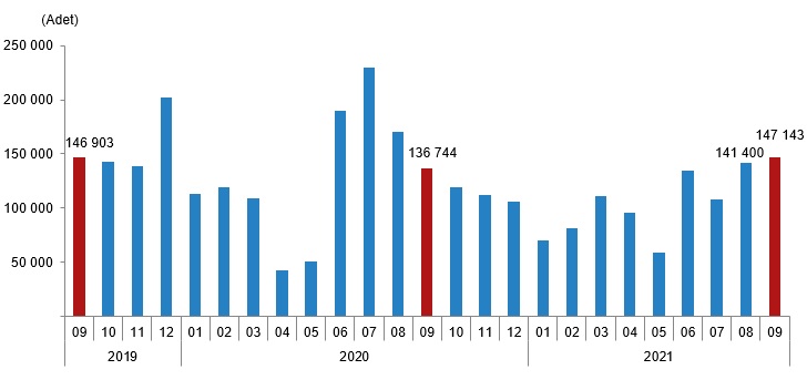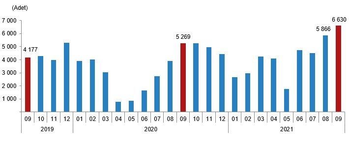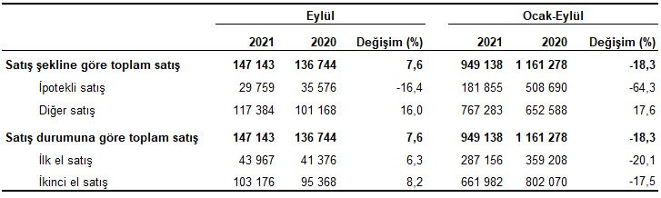 Türkiye genelinde konut satışları Eylül ayında bir önceki yılın aynı ayına göre %7,6 artarak 147 bin 143 oldu. Konut satışlarında İstanbul 28 bin 229 konut satışı ve %19,2 ile en yüksek paya sahip oldu. Satış sayılarına göre İstanbul'u 14 bin 218 konut satışı ve %9,7 pay ile Ankara, 8 bin 806 konut satışı ve %6,0 pay ile İzmir izledi. Konut satış sayısının en az olduğu iller sırasıyla 14 konut ile Hakkari, 41 konut ile Ardahan ve 78 konut ile Şırnak oldu.