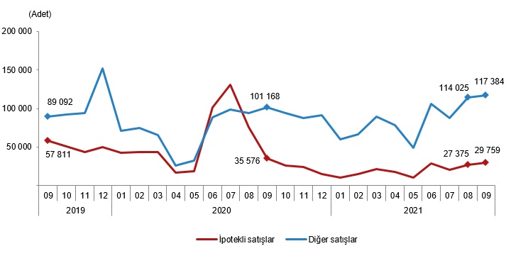 Türkiye genelinde diğer konut satışları Eylül ayında bir önceki yılın aynı ayına göre %16,0 artarak 117 bin 384 oldu. Toplam konut satışları içinde diğer satışların payı %79,8 olarak gerçekleşti. Ocak-Eylül döneminde gerçekleşen diğer konut satışları ise bir önceki yılın aynı dönemine göre %17,6 artışla 767 bin 283 oldu.