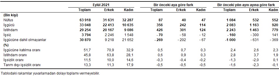 İstihdam edilenlerin sayısı 2021 yılı Eylül ayında bir önceki aya göre 426 bin kişi artarak 29 milyon 254 bin kişi, istihdam oranı ise 0,6 puanlık artış ile %45,8 oldu.