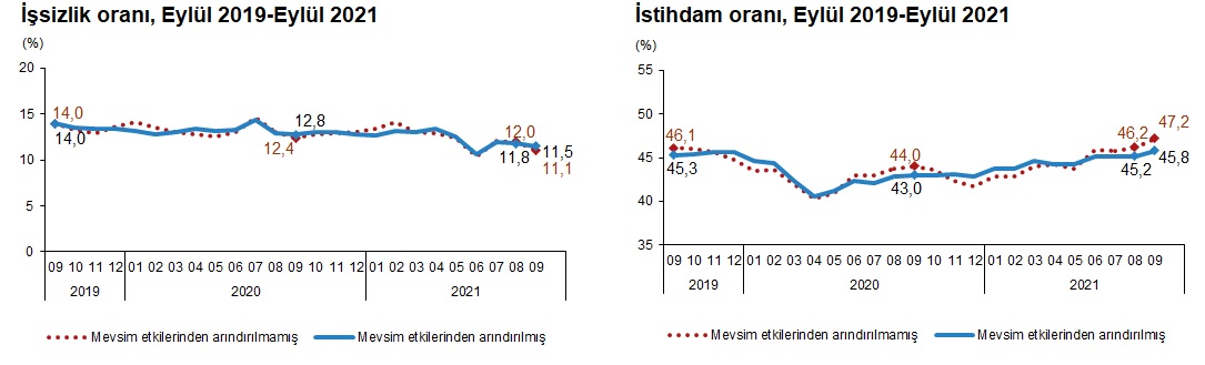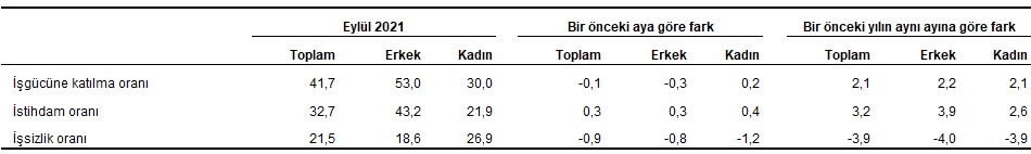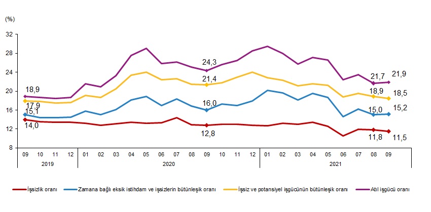 Zamana bağlı eksik istihdam, potansiyel işgücü ve işsizlerden oluşan atıl işgücü oranı 2021 yılı Eylül ayında bir önceki aya göre 0,2 puan artarak %21,9 oldu. Zamana bağlı eksik istihdam ve işsizlerin bütünleşik oranı %15,2 iken, potansiyel işgücü ve işsizlerin bütünleşik oranı %18,5 olarak gerçekleşti.