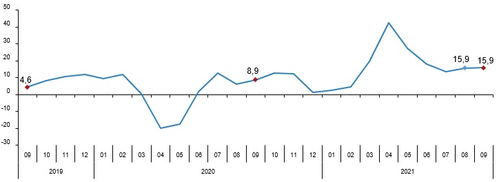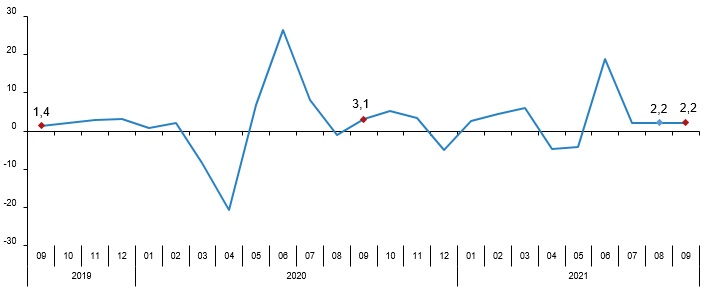 Cari fiyatlarla perakende ciro 2021 yılı Eylül ayında bir önceki aya göre %2,2 arttı. Aynı ayda gıda, içecek ve tütün satışları %1,8, gıda dışı satışlar (otomotiv yakıtı hariç) %2,5, otomotiv yakıtı satışları %2,0 arttı.