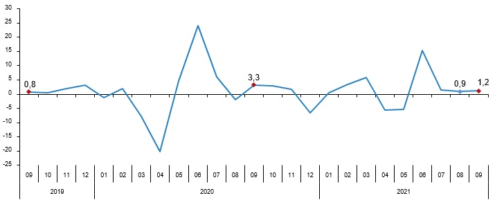 Sabit fiyatlarla perakende satış hacmi 2021 yılı Eylül ayında bir önceki aya göre %1,2 arttı. Aynı ayda gıda, içecek ve tütün satışları %1,7, gıda dışı satışlar (otomotiv yakıtı hariç) %1,0, otomotiv yakıtı satışları %0,9 arttı.