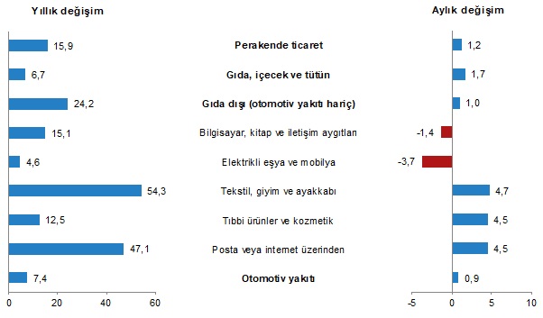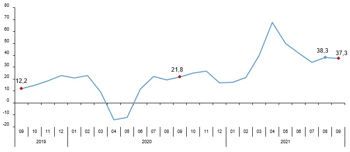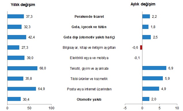 Cari fiyatlarla perakende ciro 2021 yılı Eylül ayında bir önceki yılın aynı ayına göre %37,3 arttı. Aynı ayda gıda, içecek ve tütün satışları %32,3, gıda dışı satışlar (otomotiv yakıtı hariç) %42,4, otomotiv yakıtı satışları %30,4 arttı.