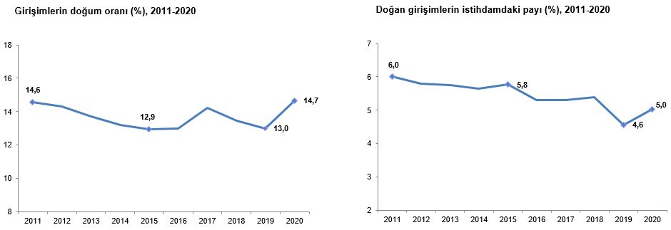 Girişimlerin 2019 yılındaki doğum oranı %13,0 ve bu girişimlerin istihdamdaki payı %4,6 iken, 2020 yılında doğum oranı %14,7'ye, istihdam payı ise %5,0'e çıktı.