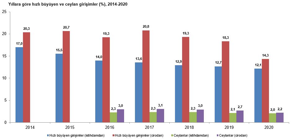 Aynı yıl için hızlı büyüyen genç girişimler (ceylan) oranı ise %2,0 oldu. Ciroya göre hızlı büyüyen girişimler oranı 2020 yılında %14,3, ceylan girişimler oranı ise %2,2 oldu.