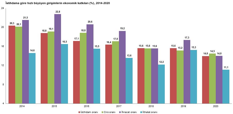 Aynı yıl için ithalat payı ise %11,1 oldu. İstihdama göre hızlı büyüyen girişimlerin 2020 yılında istihdam payı %14,0, ciro payı ise %14,5 oldu.