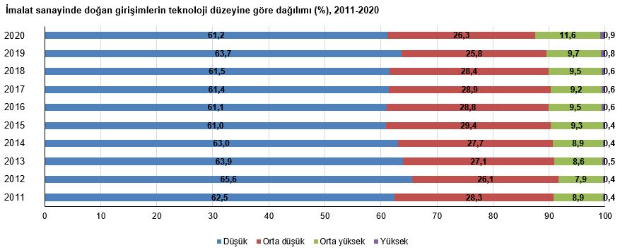 İmalat sanayinde 2020 yılında doğan girişimlerin %26,3'ü orta düşük, %11,6'sı orta yüksek, %0,9'u ise yüksek teknoloji düzeyine sahip girişimler oldu.