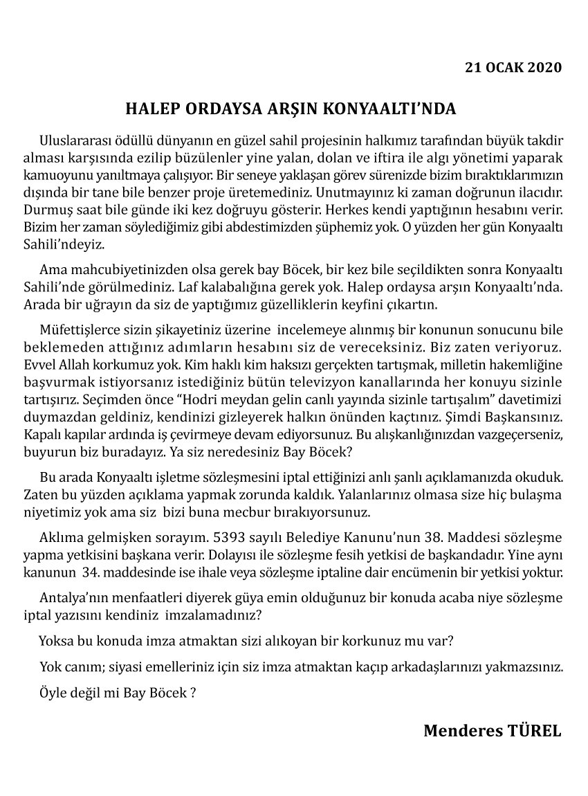 Projenin hayata geçirildiği dönemde başkanlık yapan Menderes Türel, kararın ardından açıklamada bulundu. Yaptığı açıklamada Antalya Büyükşehir Belediye Başkanı Muhittin Böcek'e sert eleştirilerde bulunan Türel'in açıklaması şu şeklide: