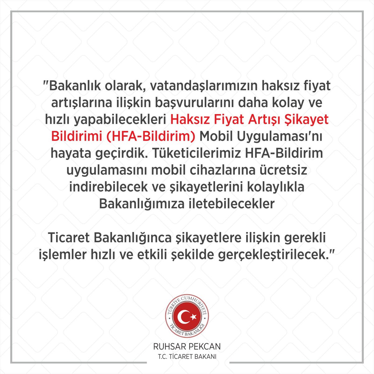 Bakanlık olarak, vatandaşlarımızın haksız fiyat artışlarına ilişkin başvurularını daha kolay ve hızlı yapabilecekleri Haksız Fiyat Artışı Şikayet Bildirimi (HFA-Bildirim) Mobil Uygulaması'nı hayata geçirdik. Tüketicilerimiz HFA-Bildirim uygulamasını mobil cihazlarına ücretsiz indirebilecek ve şikayetlerini kolaylıkla Bakanlığımıza iletebilecekler