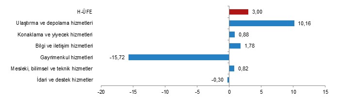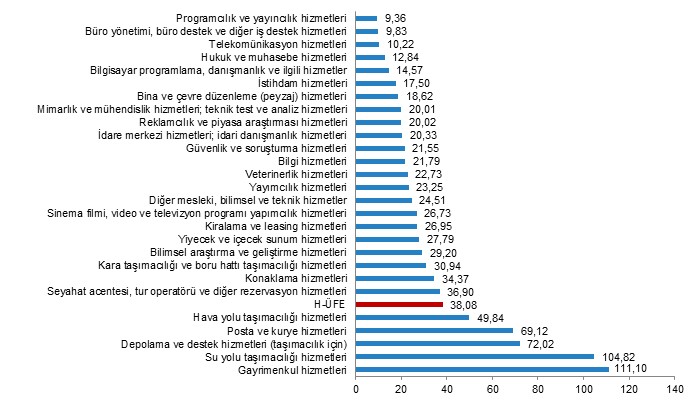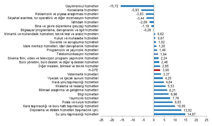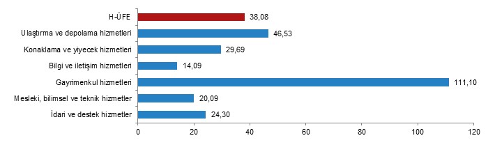 H-ÜFE sektörlerinden gayrimenkul hizmetlerinde %15,72, konaklama hizmetlerinde %5,93, reklamcılık ve piyasa araştırması hizmetlerinde %3,83 azalış gerçekleşti. Buna karşılık su yolu taşımacılığı hizmetleri %14,87, depolama ve destek hizmetleri (taşımacılık için) %13,02, kara taşımacılığı ve boru hattı taşımacılığı hizmetleri %10,00 ile endekslerin en fazla arttığı alt sektörler oldu.