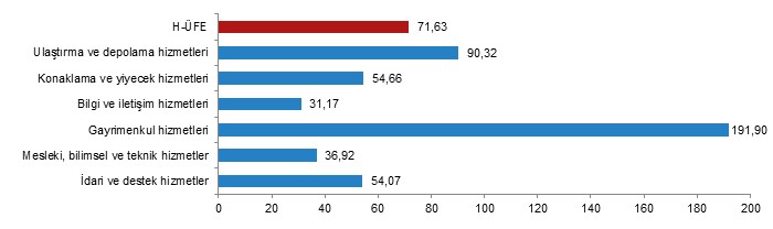 Bir önceki yılın aynı ayına göre, ulaştırma ve depolama hizmetlerinde %90,32, konaklama ve yiyecek hizmetlerinde %54,66, bilgi ve iletişim hizmetlerinde %31,17, gayrimenkul hizmetlerinde %191,90, mesleki, bilimsel ve teknik hizmetlerde %36,92, idari ve destek hizmetlerde %54,07 artış gerçekleşti.