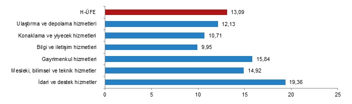Bir önceki aya göre, ulaştırma ve depolama hizmetlerinde %12,13, konaklama ve yiyecek hizmetlerinde %10,71, bilgi ve iletişim hizmetlerinde %9,95, gayrimenkul hizmetlerinde %15,84, mesleki, bilimsel ve teknik hizmetlerde %14,92, idari ve destek hizmetlerde %19,36 artış gerçekleşti.