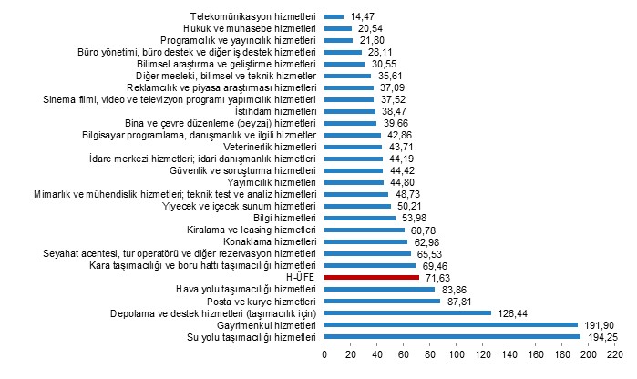 H-ÜFE sektörlerinde yıllık en düşük artış; telekomünikasyon hizmetlerinde %14,47, hukuk ve muhasebe hizmetlerinde %20,54, programcılık ve yayıncılık hizmetlerinde %21,80 olarak gerçekleşti. Buna karşılık su yolu taşımacılığı hizmetleri %194,25, gayrimenkul hizmetleri %191,90, depolama ve destek hizmetleri (taşımacılık için) %126,44 ile endekslerin en fazla arttığı alt sektörler oldu.