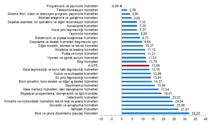 H-ÜFE'de aylık azalış gösteren tek alt sektör %0,88 ile programcılık ve yayıncılık hizmetleri oldu. En düşük artış gösteren alt sektörler ise %2,59 ile telekomünikasyon hizmetleri, %3,95 ile sinema filmi, video ve televizyon programı yapımcılık hizmetleri oldu. Buna karşılık bina ve çevre düzenleme (peyzaj) hizmetleri %32,20, istihdam hizmetleri %27,07, güvenlik ve soruşturma hizmetleri %25,06 ile endekslerin en fazla arttığı alt sektörler oldu.