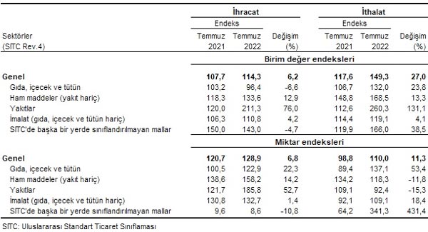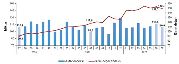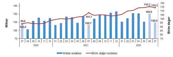 İhracat birim değer ve miktar endeksleri, Temmuz 2022