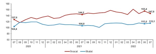 Mevsim ve takvim etkilerinden arındırılmış seriye göre; 2022 Haziran ayında 155,4 olan ihracat miktar endeksi %4,9 azalarak, 2022 Temmuz ayında 147,8 oldu. Takvim etkilerinden arındırılmış seriye göre ise; 2021 Temmuz ayında 143,0 olan ihracat miktar endeksi %2,5 artarak, 2022 Temmuz ayında 146,6 oldu.