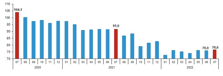 İhracat birim değer endeksinin ithalat birim değer endeksine bölünmesiyle hesaplanan ve 2021 yılı Temmuz ayında 91,6 olarak elde edilmiş olan dış ticaret haddi, 15 puan azalarak, 2022 yılı Temmuz ayında 76,6 oldu.