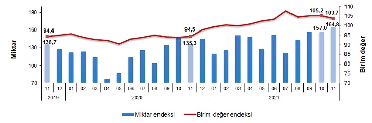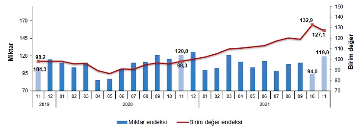 İhracat birim değer ve miktar endeksleri, Kasım 2021