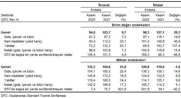 Dış ticaret endeksleri, Kasım 2021