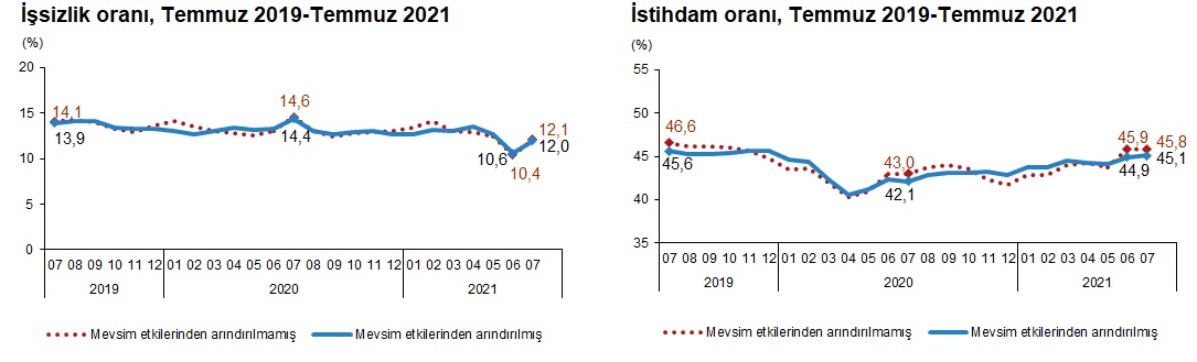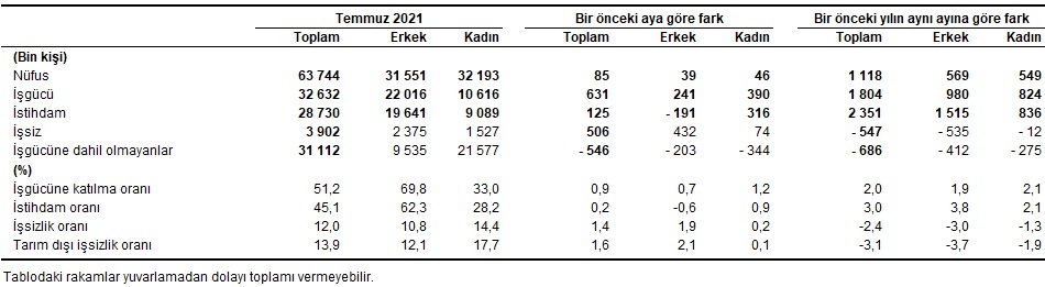 Türkiye genelinde 15 ve daha yukarı yaştaki kişilerde işsiz sayısı 2021 yılı Temmuz ayında bir önceki aya göre 506 bin kişi artarak 3 milyon 902 bin kişi oldu. İşsizlik oranı ise 1,4 puanlık artış ile %12,0 seviyesinde gerçekleşti.