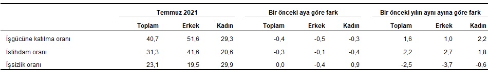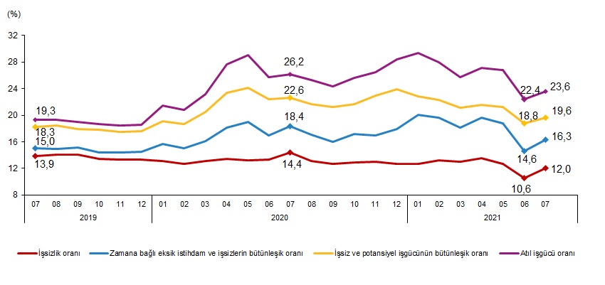 Zamana bağlı eksik istihdam, potansiyel işgücü ve işsizlerden oluşan atıl işgücü oranı 2021 yılı Temmuz ayında bir önceki aya göre 1,2 puan artarak %23,6 oldu. Zamana bağlı eksik istihdam ve işsizlerin bütünleşik oranı %16,3 iken, potansiyel işgücü ve işsizlerin bütünleşik oranı %19,6 olarak gerçekleşti.
