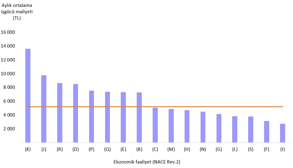 K (Finans ve sigorta faaliyetleri) sektörü, 13 587 TL ile aylık ortalama işgücü maliyetinin en yüksek olduğu sektör oldu. Bu sektörü, 9 732 TL ile J (Bilgi ve iletişim) ve 8 628 TL ile R (Kültür, sanat, eğlence, dinlence ve spor) sektörleri izledi. I (Konaklama ve yiyecek hizmeti faaliyetleri) sektörü ise 2 703 TL ile aylık ortalama işgücü maliyetinin en düşük olduğu sektör oldu. Bu sektörü 3 129 TL ile F (İnşaat) ve 3 751 TL ile S (Diğer hizmet faaliyetleri) sektörleri takip etti.