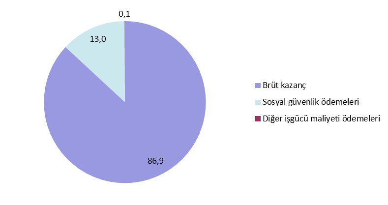 İşgücü maliyeti içinde brüt kazancın payı %86,9, sosyal güvenlik ödemelerinin payı %13,0 ve diğer işgücü maliyeti ödemelerinin payı %0,1 olarak gerçekleşti.