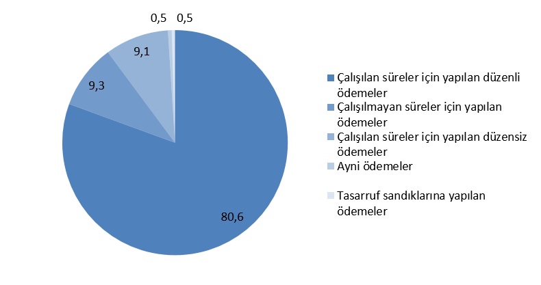Çalışılan süreler için yapılan düzenli ödemeler %80,6'lık oranla kazanç bileşenleri içinde en büyük paya sahip oldu. Çalışılmayan süreler için yapılan ödemelerin payı %9,3 olarak gerçekleşirken çalışılan süreler için yapılan düzensiz ödemeler kazançtan %9,1 oranında pay aldı. Ayni ödemelerin kazanç içindeki payı %0,5 iken tasarruf sandıklarına yapılan ödemelerin payı %0,5 oldu.