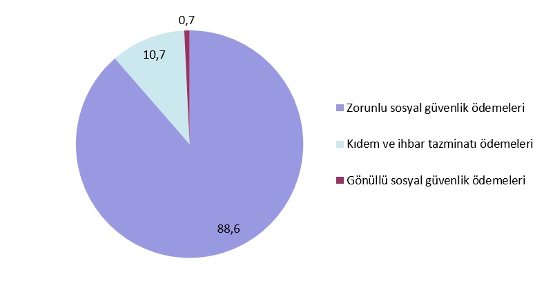 Sosyal güvenlik ödemeleri içinde en büyük payı %88,6 oranıyla zorunlu sosyal güvenlik ödemeleri alırken, gönüllü sosyal güvenlik ödemelerinin oranı %0,7 ve kıdem ve ihbar tazminatı ödemelerinin oranı %10,7 olarak gerçekleşti.