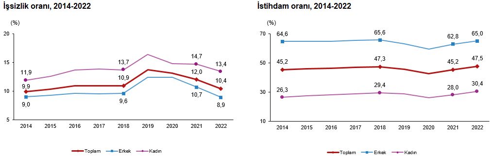 İstihdam edilenlerin sayısı 2022 yılında bir önceki yıla göre 1 milyon 955 bin kişi artarak 30 milyon 752 bin kişi, istihdam oranı ise 2,3 puanlık artış ile %47,5 oldu. Bu oran erkeklerde %65,0 iken kadınlarda %30,4 olarak gerçekleşti.