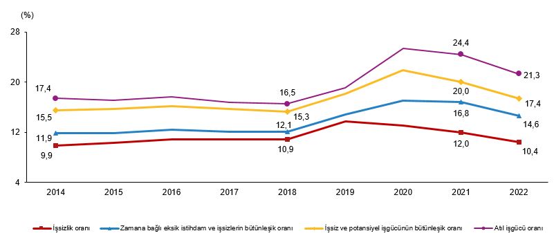 Zamana bağlı eksik istihdam, potansiyel işgücü ve işsizlerden oluşan atıl işgücü oranı 2022 yılında bir önceki yıla göre 3,1 puan azalarak %21,3 oldu. Zamana bağlı eksik istihdam ve işsizlerin bütünleşik oranı %14,6 iken, işsiz ve potansiyel işgücünün bütünleşik oranı %17,4 olarak gerçekleşti.