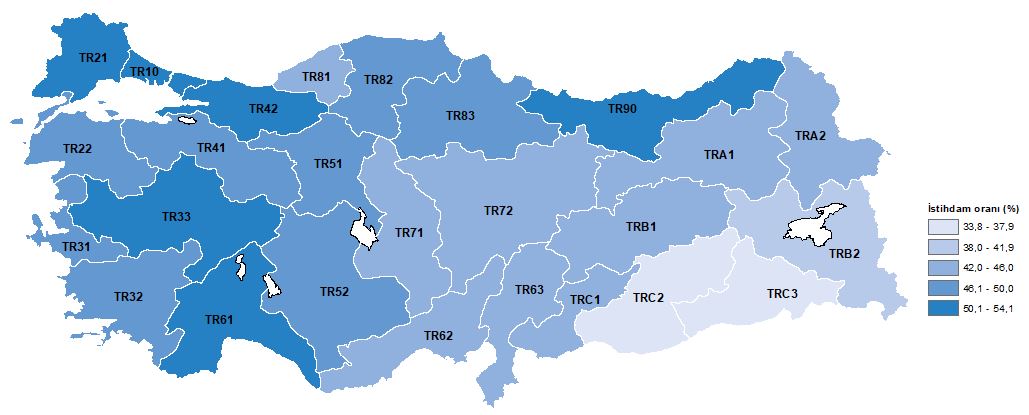 En yüksek istihdam oranı %54,1 ile TR21 (Tekirdağ, Edirne, Kırklareli) Bölgesi'nde gerçekleşti. En düşük istihdam oranı ise %33,8 ile TRC3 (Mardin, Batman, Şırnak, Siirt) Bölgesi'nde oldu.