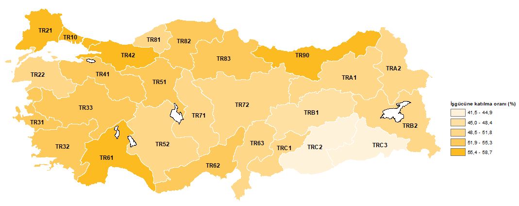 En yüksek işgücüne katılma oranı %58,7 ile TR21 (Tekirdağ, Edirne, Kırklareli) Bölgesi'nde gerçekleşti. En düşük işgücüne katılma oranı ise %41,5 ile TRC3 (Mardin, Batman, Şırnak, Siirt) Bölgesi'nde oldu.