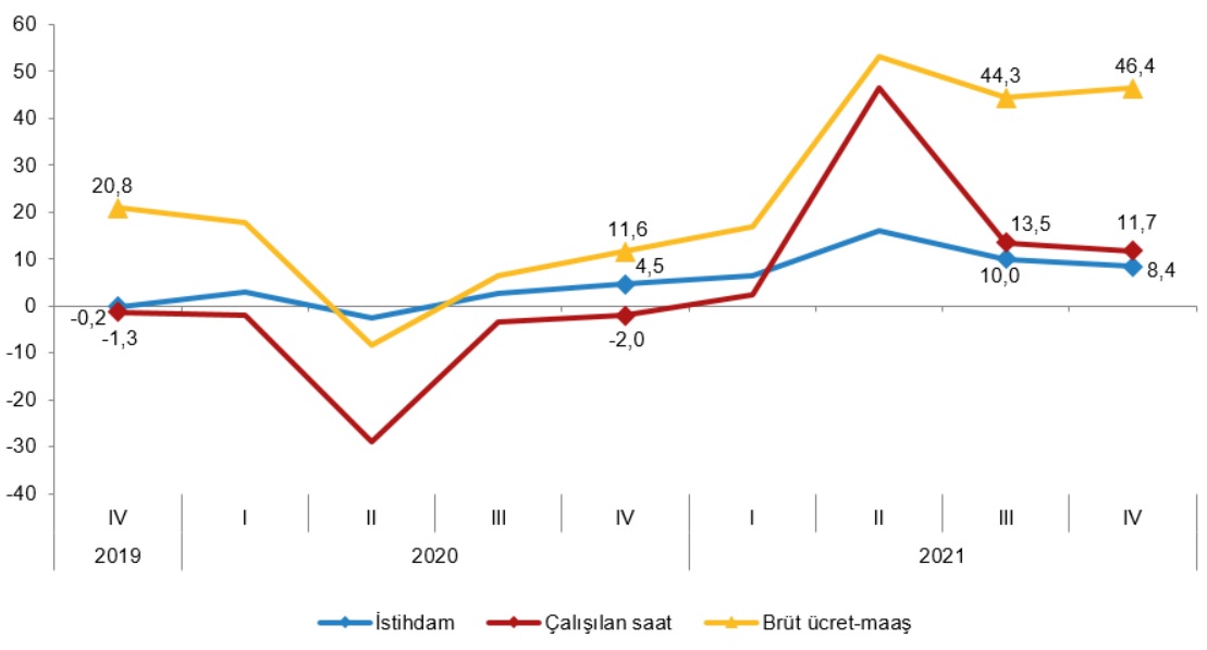 Sanayi, inşaat ve ticaret-hizmet sektörleri toplamında brüt ücret-maaş endeksi, 2021 yılı lV. çeyreğinde bir önceki yılın aynı çeyreğine göre %46,4 arttı. Alt sektörler incelendiğinde, endeks; sanayi sektöründe %42,3, inşaat sektöründe %39,2 ve ticaret-hizmet sektörlerinde %50,6 arttı.