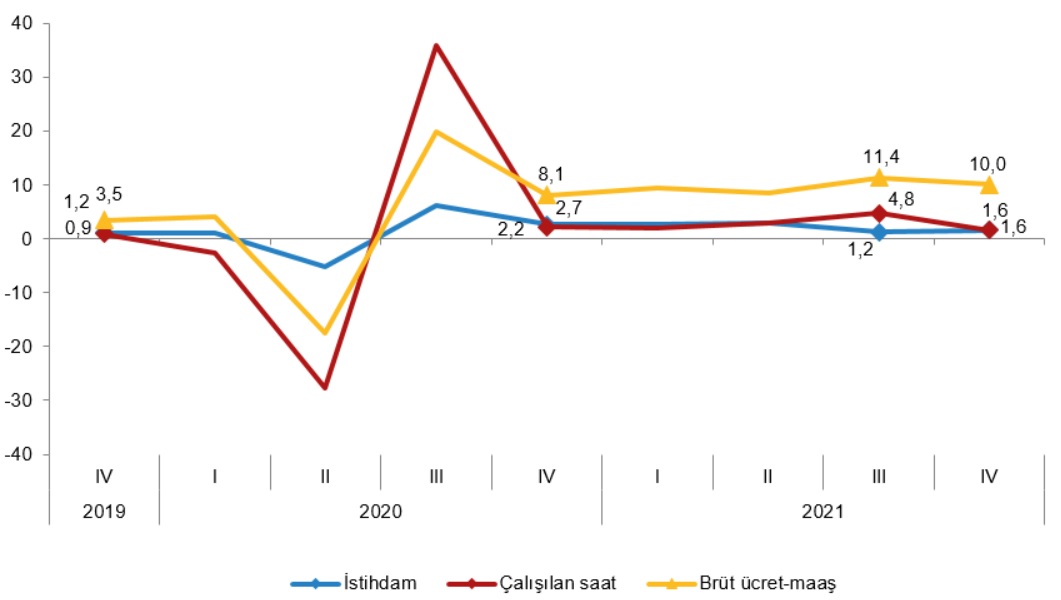 Sanayi, inşaat ve ticaret-hizmet sektörleri toplamında brüt ücret-maaş endeksi, 2021 yılı lV. çeyreğinde bir önceki çeyreğe göre %10 arttı. Alt sektörler incelendiğinde, endeks; sanayi sektöründe %8,6, inşaat sektöründe %8 ve ticaret-hizmet sektörlerinde %11,4 arttı.