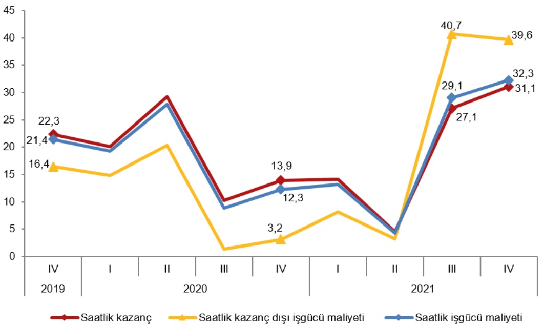 Sanayi, inşaat ve ticaret-hizmet sektörleri toplamında saatlik kazanç dışı işgücü maliyeti endeksi, 2021 yılı lV. çeyreğinde bir önceki yılın aynı çeyreğine göre %39,6 arttı. Alt sektörler incelendiğinde, endeks; sanayi sektöründe %45,6, inşaat sektöründe %34,7, ticaret-hizmet sektörlerinde %36,3 arttı.