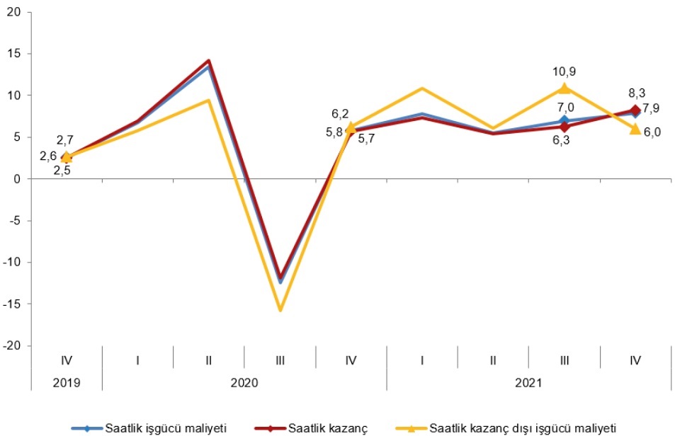 Sanayi, inşaat ve ticaret-hizmet sektörleri toplamında saatlik işgücü maliyeti endeksi, 2021 yılı lV. çeyreğinde bir önceki çeyreğe göre %7,9 arttı. Alt sektörler incelendiğinde, endeks; sanayi sektöründe %7,4, inşaat sektöründe %9,1 ve ticaret-hizmet sektörlerinde %8 arttı.