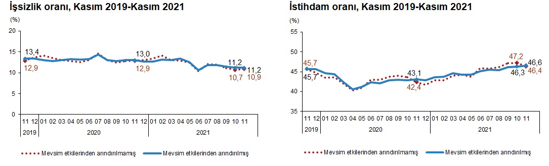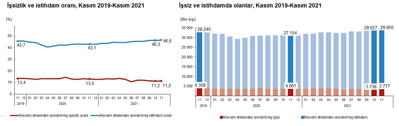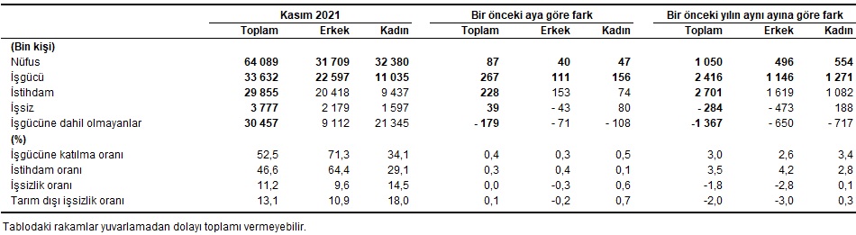 İstihdam edilenlerin sayısı 2021 yılı Kasım ayında bir önceki aya göre 228 bin kişi artarak 29 milyon 855 bin kişi, istihdam oranı ise 0,3 puanlık artış ile %46,6 oldu.