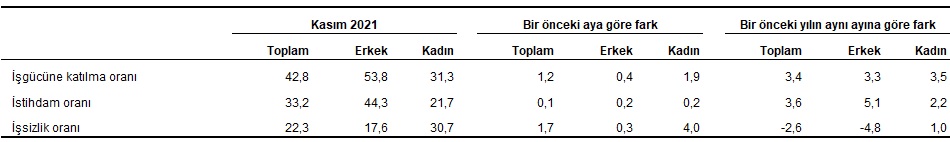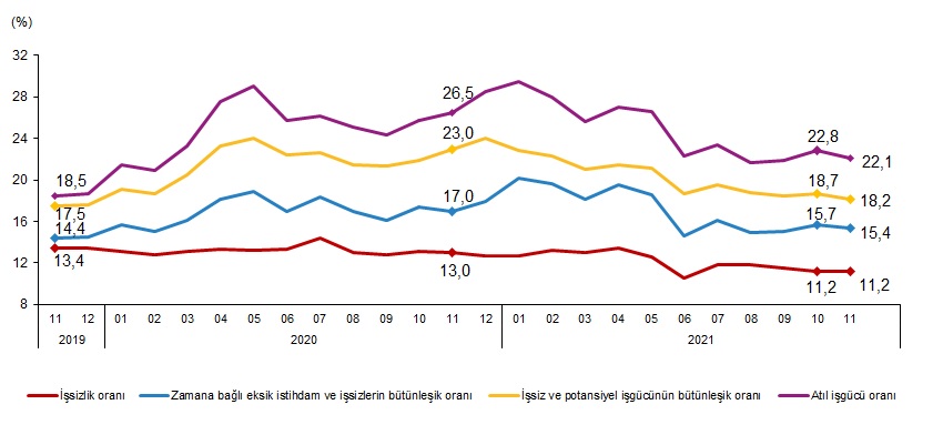 Zamana bağlı eksik istihdam, potansiyel işgücü ve işsizlerden oluşan atıl işgücü oranı 2021 yılı Kasım ayında bir önceki aya göre 0,7 puan azalarak %22,1 oldu. Zamana bağlı eksik istihdam ve işsizlerin bütünleşik oranı %15,4 iken, potansiyel işgücü ve işsizlerin bütünleşik oranı %18,2 olarak gerçekleşti.
