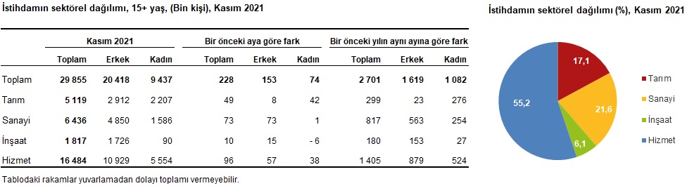 Kasım ayında istihdam edilenlerin sayısı bir önceki aya göre tarım sektöründe 49 bin kişi, sanayi sektöründe 73 bin kişi, inşaat sektöründe 10 bin kişi, hizmet sektöründe 96 bin kişi arttı. İstihdam edilenlerin %17,1'i tarım, %21,6'sı sanayi, %6,1'i inşaat, %55,2'si ise hizmet sektöründe yer aldı.