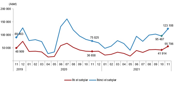 Türkiye genelinde ikinci el konut satışları Kasım ayında bir önceki yılın aynı ayına göre %62,4 artış göstererek 123 bin 108 oldu. Toplam konut satışları içinde ikinci el konut satışının payı %68,8 oldu. İkinci el konut satışları Ocak-Kasım döneminde ise bir önceki yılın aynı dönemine göre %8,3 azalışla 880 bin 577 olarak gerçekleşti.