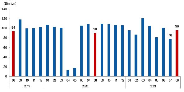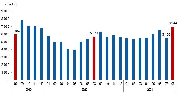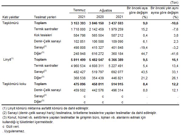 Katı yakıtların satılabilir üretim ve teslimat miktarları, Ağustos 2021