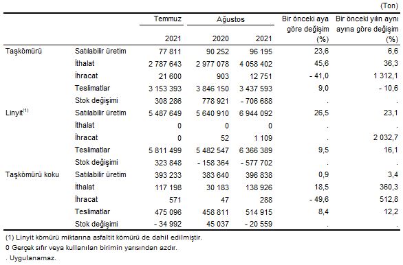 Taşkömürü koku satılabilir üretimi ise Ağustos ayında 396 bin 838 ton olarak gerçekleşti. Bu üretim bir önceki aya göre %0,9, bir önceki yılın aynı ayına göre %3,4 arttı.