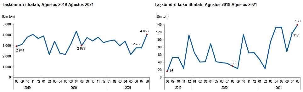 Taşkömürü ithalatı Ağustos ayında bir önceki aya göre %45,6, bir önceki yılın aynı ayına göre ise %36,3 arttı.