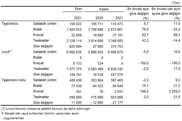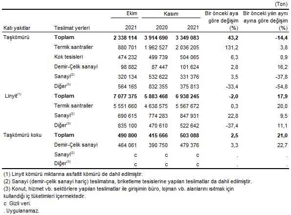 Katı yakıtların satılabilir üretim ve teslimat miktarları, Kasım 2021