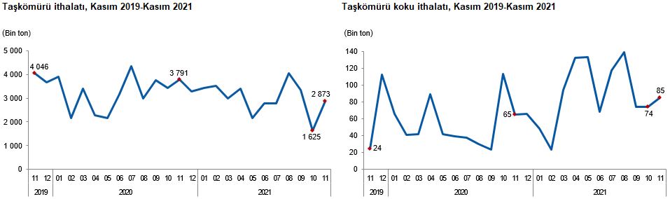 Taşkömürü koku satılabilir üretimi ise Kasım ayında 397 bin 465 ton olarak gerçekleşti. Bu üretim bir önceki aya göre %2,2 azalırken, bir önceki yılın aynı ayına göre %9,2 arttı.